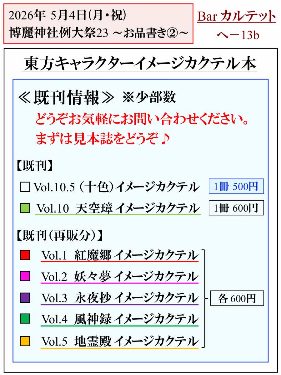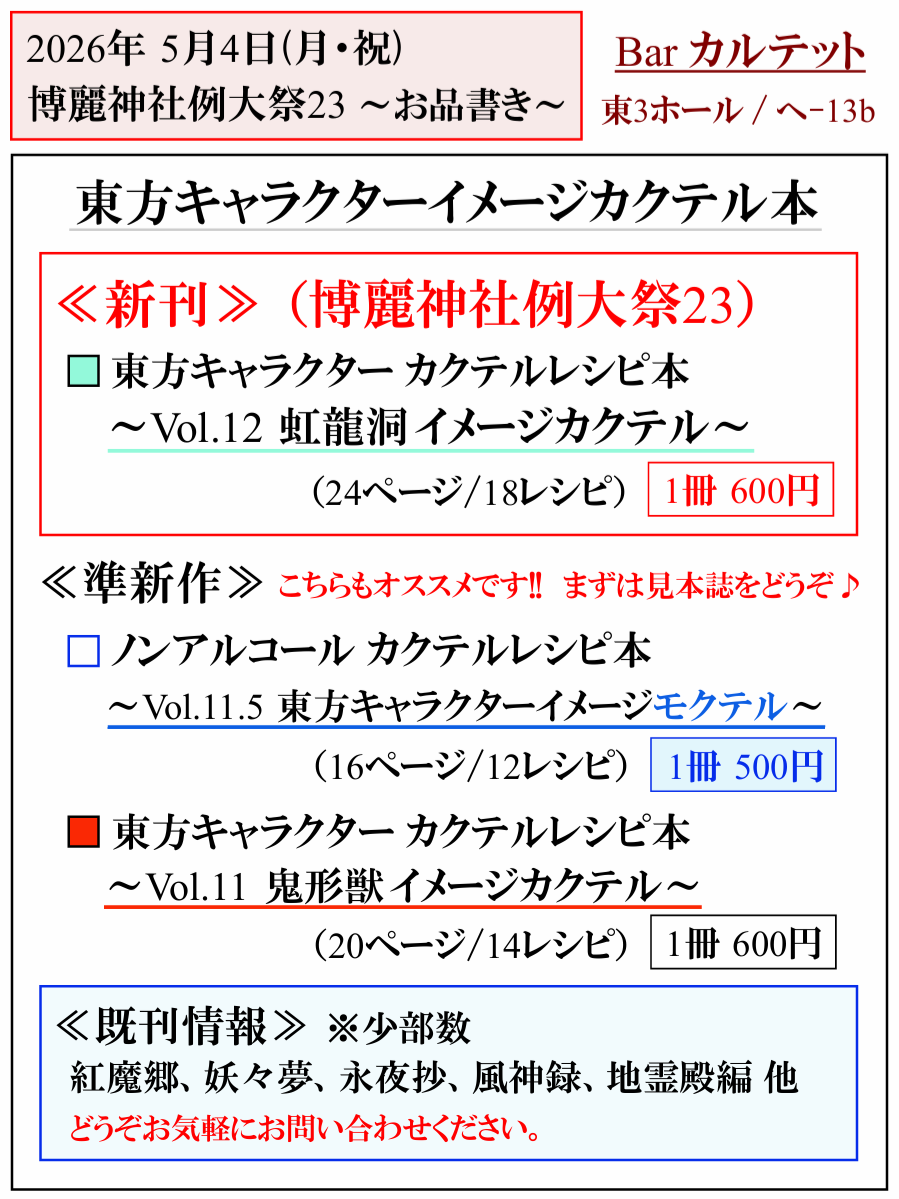 今回も東方キャラクターをイメージしたカクテルのレシピ本を出品します♪