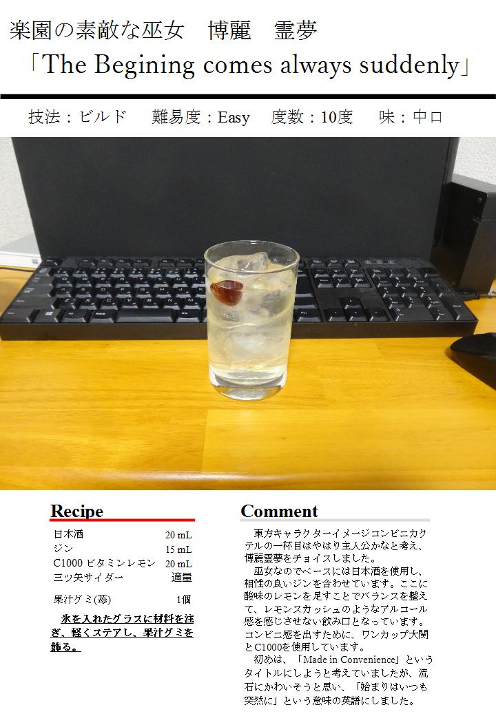 前回、お知らせで告知していましたが、新たなカテゴリの東方カクテルが誕生したので早速上げていこうと思います。